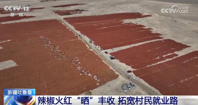 最近在新疆吐鲁番的晾晒场,火红的辣椒铺满戈壁。晾晒工作需要大量劳动力,因此,周边不少村民都选择来到这里就近务工,获得了实实在在的收益。