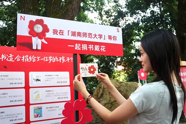 图说:在湖南师范大学,大学生们参与久久公益节,将适合儿童阅读的图书捐赠到乡村学校。