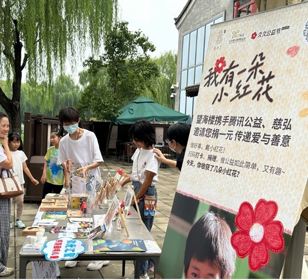 图说:北京慈弘慈善基金会在后海望海楼举办“小红花公益市集”,通过义卖来支持乡村学校图书角建设,受到市民和游客们的欢迎。