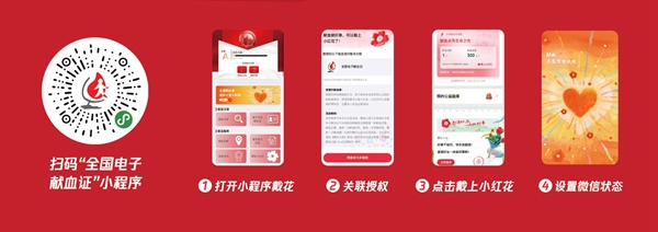 公益中国网讯 近日,“全国电子献血证”微信小程序上新“小红花”功能。每位无偿献血者都可以登录小程序,领取属于自己的荣誉小红花,并将小红花设置为自己的微信状态。