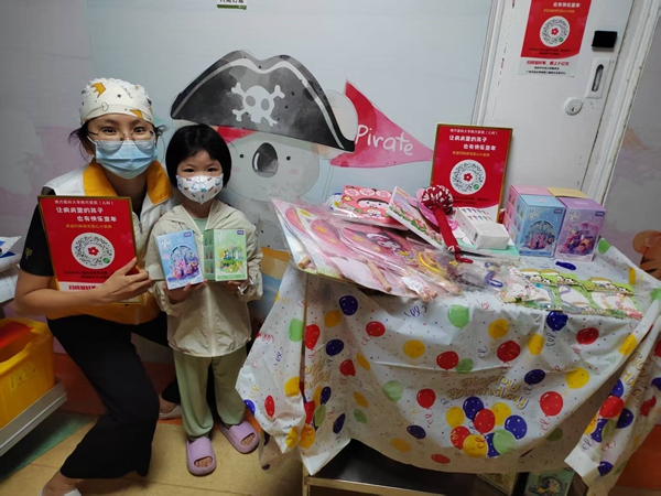 图说:在南方医科大学南方医院,志愿者和小朋友们一起开展爱心义卖。
