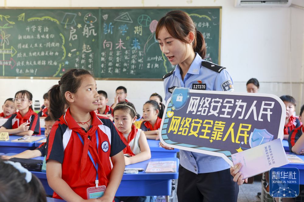 9月15日,在山东省临沂市沂南县第三实验小学,沂南县公安局网络安全保卫大队的民警给学生普及网络安全知识。新华社发(王彦冰摄)