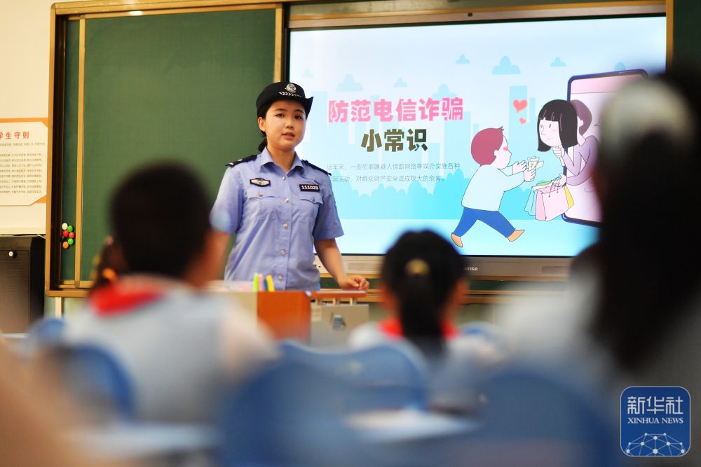 9月15日,在山东省青岛市市北区延安二路小学开展的网络安全教育主题活动上,民警为学生们讲解防范电信诈骗小常识。新华社发(王海滨摄)