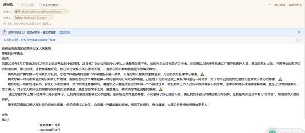 “通过您在列车上毫不犹豫伸出援手的样子,让我真切感受到医者仁心的温暖。这份陌生却厚重的善意,不仅缓解了我心理的不适,更让我的小孩及时得到救治与保护。让我在现实生活中看见‘白求恩’,相信白衣天使的存在。”事后,徐月向医院发来感谢信,信中写道:“虽千言万语都难以表达我们全家对孙平的感谢与感激,也希望这份善意能传递给更多人。”