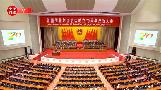 70年前,在党中央亲切关怀和党的民族政策光辉照耀下,新疆维吾尔自治区宣告成立。70年来特别是新时代以来,在党的领导下,新疆各族人民共同当家作主,不断夺取社会主义革命、建设和改革开放的伟大胜利。