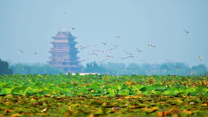 秋意渐浓,暑热散尽,作为蟒蛇河源头的大纵湖,碧波荡漾、岸绿景明,成群的飞鸟时而掠过湖面、时而栖落岸畔,处处跃动着生态修复带来的鲜活气息。