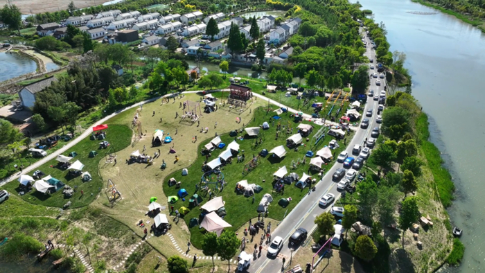 国庆假期,蟒蛇河畔露营帐篷点点,众多市民自驾而来,在水清岸绿中享受闲暇,领略里下河水乡的独特韵味。