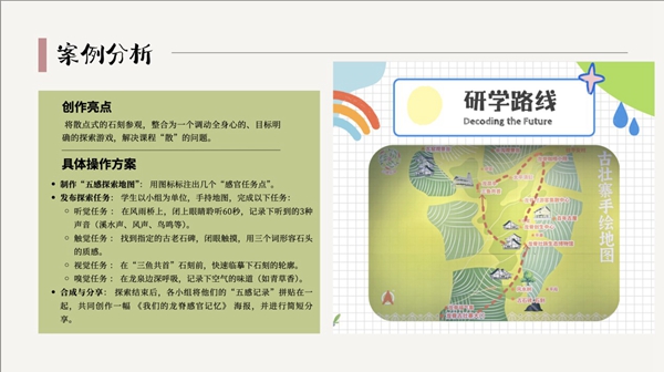 中国农业大学文旅融合2组则聚焦龙脊村被忽视的“石文化”,设计分层研学课程。针对小学生推出“石刻寻宝”游戏,针对初中生开展“三鱼共首文化解读”思辨课,同时开发石刻冰箱贴、石兽挂件等文创产品。“石文化是龙脊的‘无声史书’,我们希望通过研学让它被读懂、被触摸,更带动民宿、餐饮等产业发展。”团队代表表示。