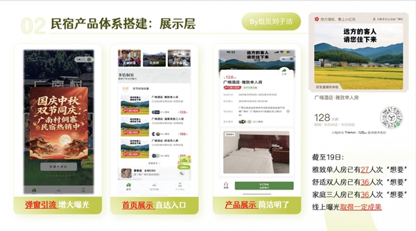 中国农业大学数字赋能4组针对广南村民宿“线上声量低、运营能力弱”的痛点,基于腾讯云服务小程序搭建“引流-转化-运营”闭环。团队重构小程序展示逻辑,增设双节住宿优惠弹窗、民宿预订首页入口,并开发共富AI文案生成工具,帮助民宿主理人一键生成带“侗寨待客文化”的特色介绍。“我们还编写了小程序使用指南和定价标准,教会村民自主运营,目前小程序想要人次显著提升,线上曝光实现突破。”团队代表介绍道。