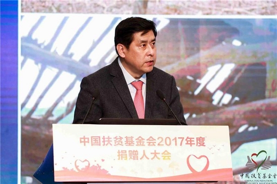 中国扶贫基金会理事长郑文凯在致辞中说,在新时代背景下,2017 年,中国扶贫基金会完成理事会换届并将年度工作定位为“扩大影响,助力攻坚”。面对机遇与挑战,全会团结一心,砥砺前行,紧紧围绕国家脱贫攻坚战略和“一带一路”倡议,推动机构“一体两翼”战略有效落地。2018 年是全面贯彻落实党的十九大精神的开局之年,是全面打赢脱贫攻坚战三年决战的关键一年,中国扶贫基金会将会与各方脱贫力量携手共进,同心同力,为脱贫攻坚事业作出新贡献!
