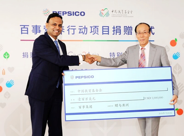 百事公司大中华区总裁兼首席执行官柯睿楠向中国扶贫基金会理事长郑文凯捐赠支票