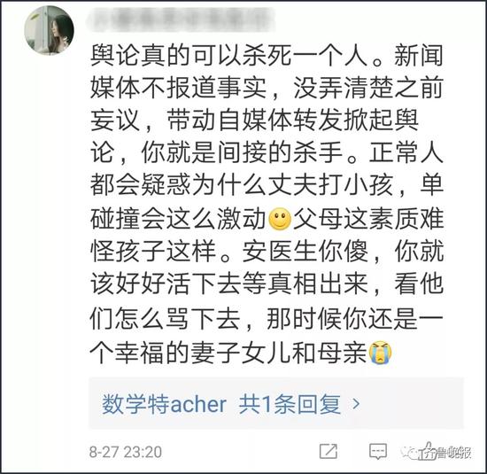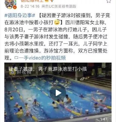 据安医生的同事张医生讲述,8月20日,安医生和丈夫去游泳,在泳池里,两个13岁男生可能对安医生做出了冒犯动作,安医生让他道歉,但男生拒绝道歉,并朝其吐口水,做鬼脸,还有一系列侮辱性动作,安医生老公看不下去了,情绪有点激动,便冲过去将该学生朝水里按。