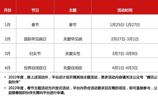 2022年,腾讯公益平台将在每个月份开放一场“主题小红花日配捐活动”,将温暖延伸到全年。每场主题小红花配捐活动,腾讯公益慈善基金会都将提供配捐。一季度的小红花主题日配捐活动已经出炉,分别是“新春小红花日”、“关爱罕见病小红花日”、“关爱女性小红花日”和“关爱自闭症小红花日”。主题日的立意更多是希望能够让大家关注到这些议题,去帮助有需要的人群,也希望可以通过主题日的方式让更多小众的好项目被看见。
