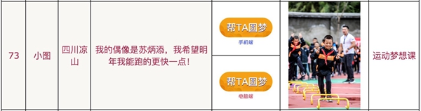 在“小红花愿望清单”中,一名四川凉山男孩小图的愿望被记录下来:我的偶像是苏炳添,我希望明年能跑得更快一点!
