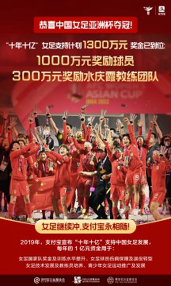 据悉,这1300万元的赛事夺冠奖金,全部出自支付宝“十年十亿”支持中国女足发展计划,将由足协向球队发放。作为中国女足全面战略伙伴、中国女足全面战略共建伙伴以及中国女足独家战略合作伙伴,支付宝在2019年启动“十年十亿”支持中国女足发展计划,每年一个亿资金主要用于中国女足国家队的奖金及训练水平提升、女足球员伤病保障及退役转型、女足技术发展及教练员培养、青少年女足运动推广及发展等四个方面。