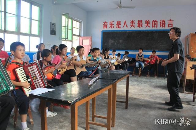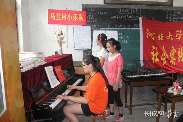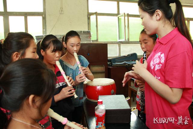 河北大学志愿者对马兰村学生进行音乐现场教学。