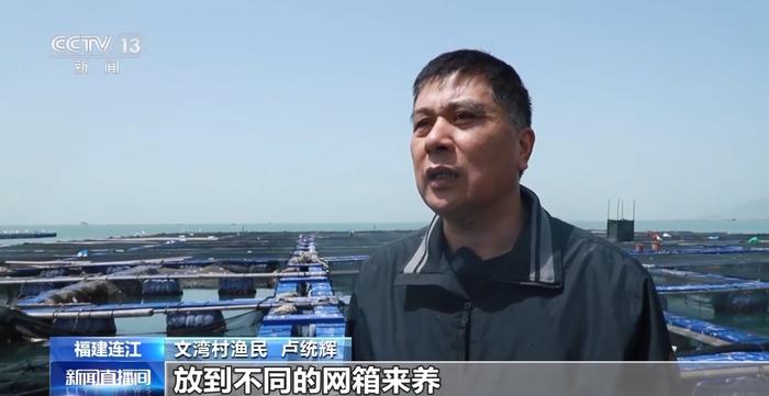 福建省连江县文湾村渔民 卢统辉:分三档,大、中、小,放到不同的网箱来养,如果不分,如果投料下去,料全部都是大的吃走,小的就吃不到,所以说要分开不同的网箱养。