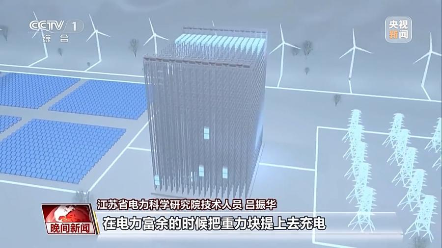 江苏省电力科学研究院技术人员 吕振华:这个大楼里一共有96部“电梯”,共同组合成48个单元模块同时作业,在电力富余的时候把重力块提上去充电,用电高峰的时候,把重力块放下来向电网放电,4小时就可以发10万度电。