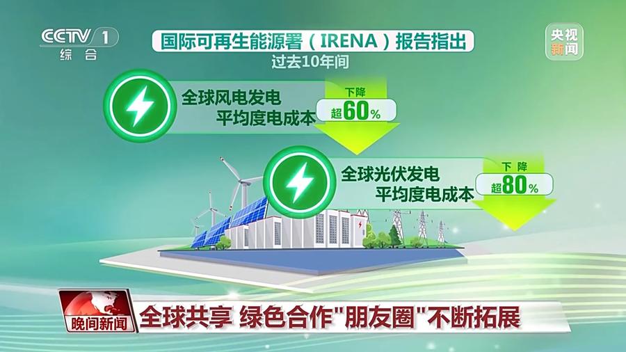如今,中国已成为全球最大的新能源装备和新能源利用大国。国际可再生能源署(IRENA)报告指出,过去10年间,全球风电、光伏发电的平均度电成本,分别下降超60%和80%,其中很大一部分归功于中国的贡献。