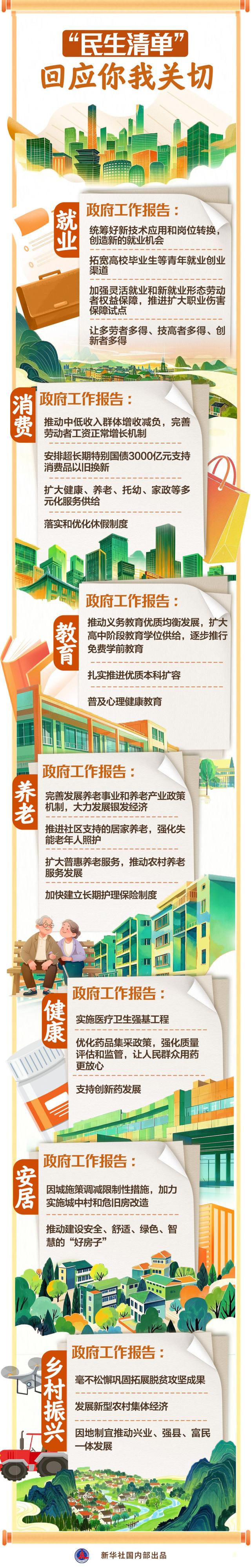 人民幸福安康是推动高质量发展的最终目的。梳理报告中有新意、有温度的惠民政策,一份“民生清单”跃然眼前,勾勒出一幅幅与你我密切相关的民生图景。