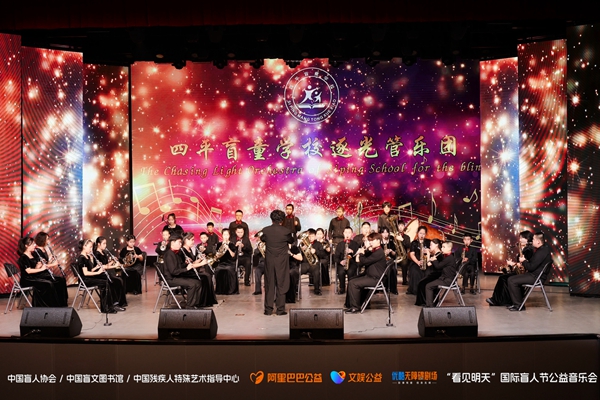 音乐会上,四平盲童学校逐光管乐团表演《青春舞曲》。