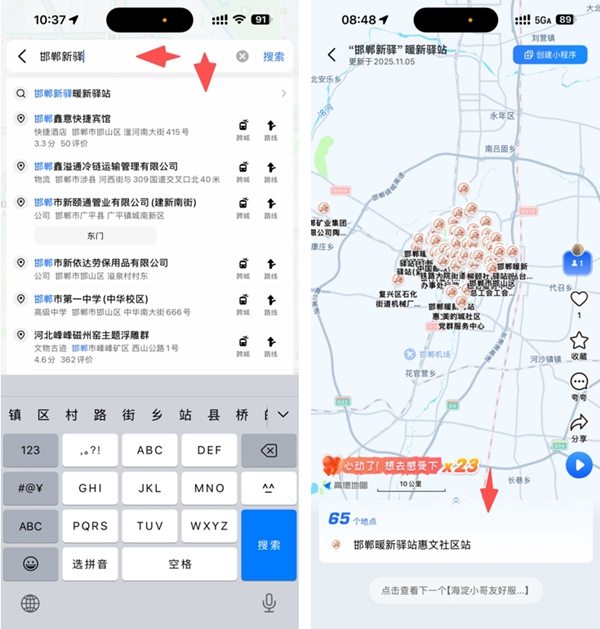 用户只需在高德地图APP搜索“邯郸新驿”关键词,或通过小程序广场进入公益地图界面,即可查看驿站详细信息,包括营业时间、服务电话、服务内容等。页面不仅标注了基础保障与特色服务,还支持一键规划最优路线,一键导航、位置分享等功能。