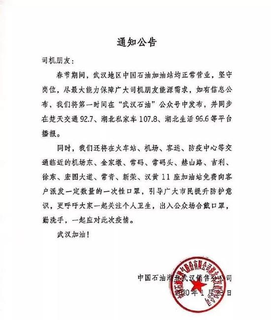 中国石油:武汉加油站正常营业,天然气供应充足,免费派发一次性口罩