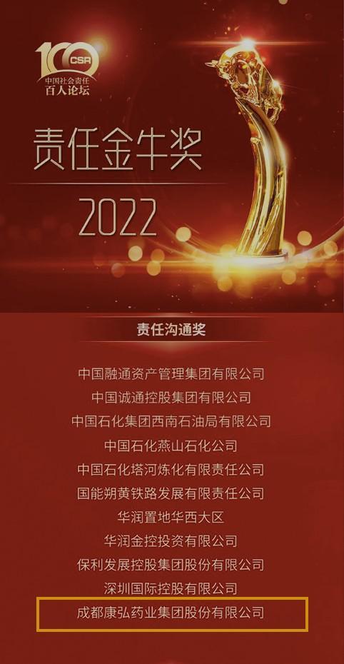 中国社会责任百人论坛成立于2016年,是中国社会责任领域权威平台,论坛面向国内外优秀企业共设11个奖项奖,以表彰企业在经济、社会、环境等方面的高效履职。此次“责任金牛奖”既是对康弘药业2021社会责任报告的高度认可,也对企业履行社会责任的贡献给予肯定。