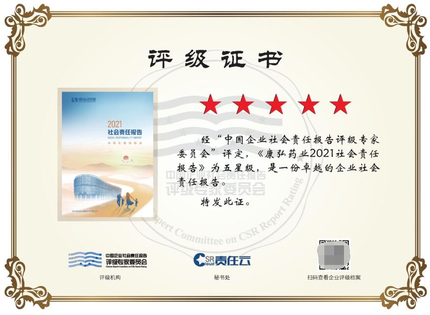 康弘药业积极履行社会责任,受到社会各界认可,先后荣获2022年,集团荣获深交所国证ESG评级AAA级、“2021中国民营企业社会责任100强”、中国企业社会责任发展指数医药生物制造业三强、2021年度医药行业社会责任突出贡献等荣誉。