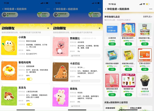 这些能量的用途十分广泛,既可以用于在蚂蚁森林申请种下真树,为防风固沙、修复生态贡献力量;也能在闲鱼“神奇鱼塘”内兑换丰富权益,从实用的寄件券、独具特色的专属头像框、有趣的“动物朋友”、专属主题皮肤,到蜜雪冰城的清甜饮品、闲鱼定制的鲜活植物,各类福利覆盖生活所需,充分满足消费者的多元需求。