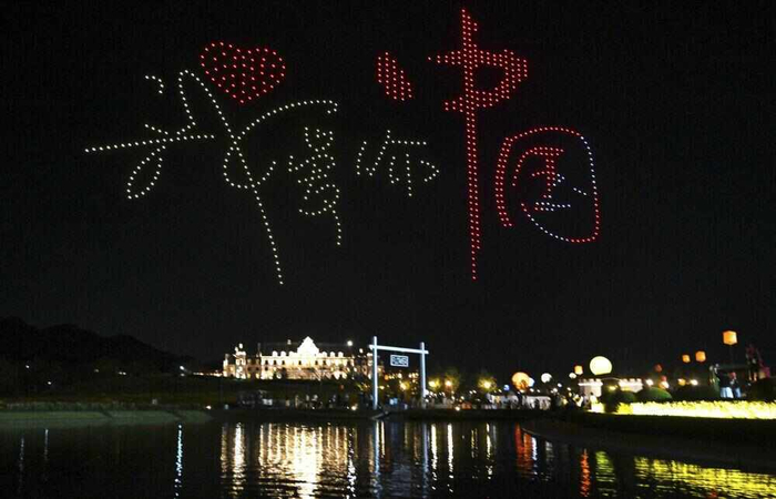 10月4日晚,在浙江省金华市武义县花田美地景区,精彩的无人机表演为游客呈现了一场视觉盛宴。新华社发(张建成摄)