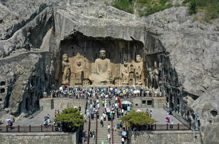 近年来,河南省洛阳市充分挖掘历史文化资源,不断打造文旅新业态与消费新场景。这是5月20日,游客在龙门石窟游玩(无人机照片)。新华社记者 郝源 摄