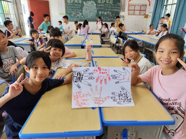 (广东外语外贸大学-七星协励小队让孩子们在心理知识科普课堂上画出“情绪五指图”)