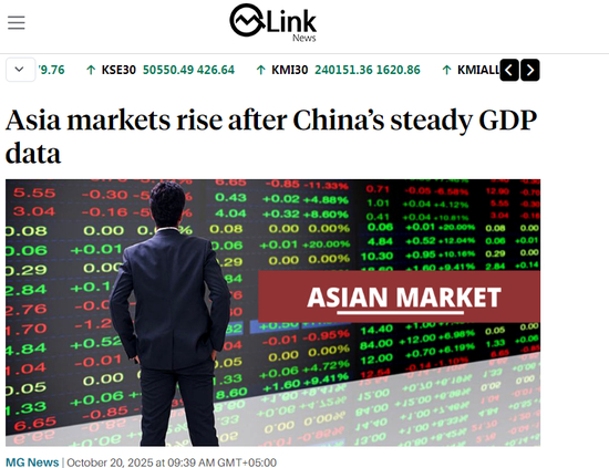 巴基斯坦金融网站Mettis Global link发表题为《亚洲股市响应中国稳健GDP数据普涨》的文章。文章分析称,亚洲市场20日迎来开门红,得益于中国的最新经济数据。中国第三季度GDP同比增长4.8%,同时维持贷款市场报价利率(LPR)。股市方面,香港恒生指数大涨逾2%,内地沪深300指数上涨0.74%。日经225指数飙升近3%,首次突破49000点大关,东证指数上涨2%。