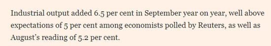 英国《金融时报》的文章分析说,9月规模以上工业增加值同比增长6.5%,显著高于路透社调查经济学家预期的5%及8月的5.2%。荷兰国际集团(ING)经济学家分析称,超预期表现主要源于外需拉动。文章说,上周,海关数据显示,中国出口保持韧性,9月同比增长8.3%,对东南亚等地区出口持续增长。