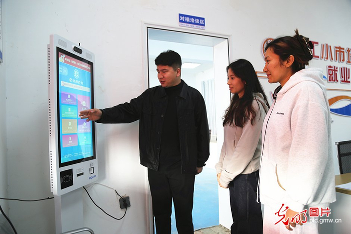 新疆阿克苏地区阿瓦提县人社局举办2025年金秋招聘月专场招聘会,来自纺织、商场、人寿、酒店、文旅等行业的30家民营企业提供420个就业岗位,吸引了许多求职者前来应聘。图为工作人员正在向求职者介绍岗位信息。