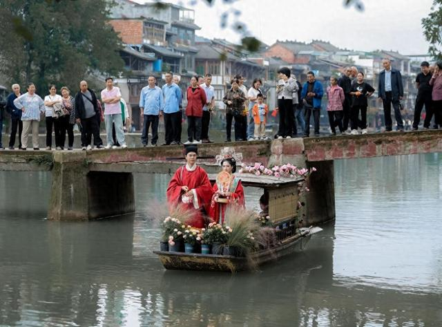 国庆节期间,成都邛崃市夹关古镇举行的水上婚礼仪式。(受访单位供图)“婚登+旅行”成为年轻人喜爱的模式之一,新人们提前选定一个目的地,在旅行的同时举办婚姻登记仪式。