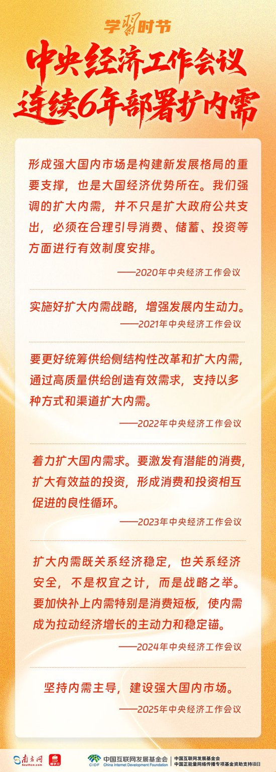 2020年以来,中央经济工作会议连续6年对扩大内需进行部署。