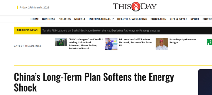 《今日报》报道截图无独有偶,尼日利亚《今日报》报道称,中东局势恶化令全球能源市场陷入困境,多国在油价飙升中承受重压。在这场风暴中,有一个国家显得格外从容——中国。文章认为,中国能源战略不仅有效拓展了可再生能源利用规模,更在相当程度上降低了对海外油气的依赖。中国的实践为其他发展中国家展现了摆脱能源依附、实现自主发展的可行路径。