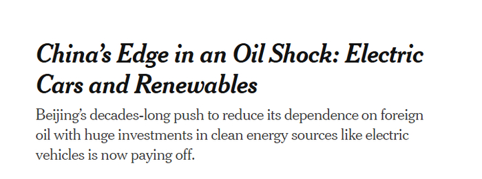 《纽约时报》报道截图面对中东战事外溢冲击全球能源市场这一议题,《纽约时报》近日报道指出,在全球主要工业国纷纷陷入能源焦虑之际,中国通过数十年来大力投资电动汽车和可再生能源,构建起真正意义上的能源抗压屏障。