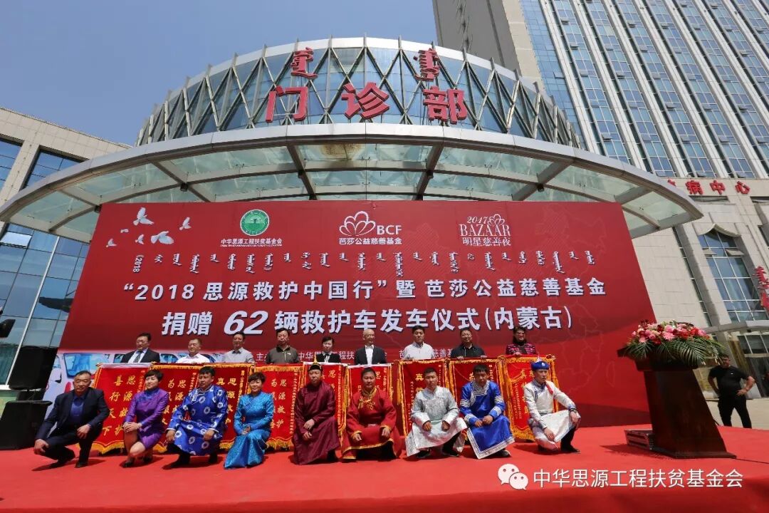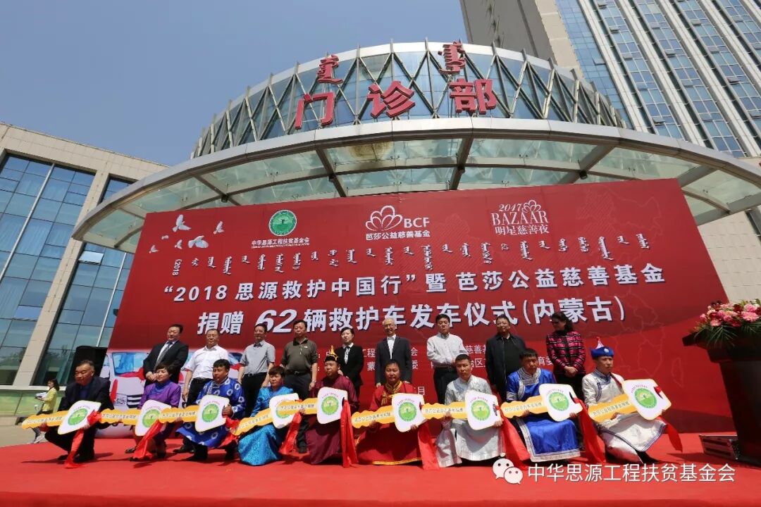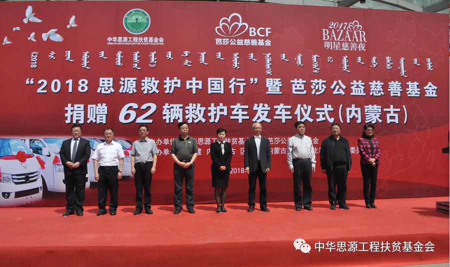 公益中国网讯 5月8日,中华思源工程扶贫基金会·芭莎公益慈善基金内蒙古救护车发车仪式在呼和浩特市国际蒙医医院举行,62辆思源救护车分别交付给阿鲁科尔沁旗、敖汉旗、宁城县等21个国定贫困县的62家医院,即日起为当地群众及草原牧民开展医疗急救、公益巡诊等服务。国家中医药管理局政策法规与监督司副巡视员刘文武,内蒙古自治区党委常委、统战部部长王莉霞,自治区人大常委会副主任、民建内蒙古区委主委李荣禧,中华思源工程扶贫基金会(以下简称“思源工程”)副秘书长陶鸣,自治区统战部常务副部长王伟,自治区人大常委、民建内蒙古区委副主委康永恒,民建内蒙古区委秘书长王建华,自治区卫计委党组成员、自治区蒙中医药管理局局长乌兰,内蒙古国际蒙医医院党组书记毕力格等领导出席发车仪式。会议由自治区蒙中医药管理局局长乌兰主持。